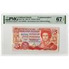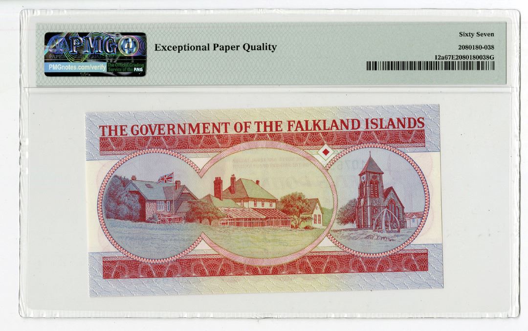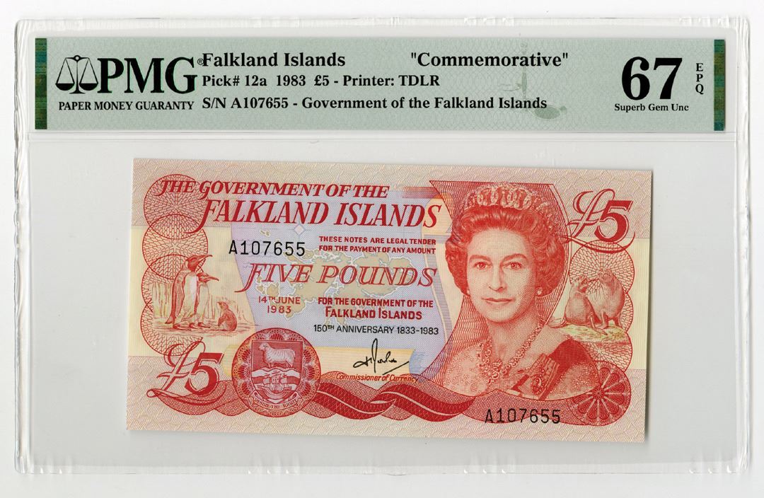 Falkland Islands, 1983. 5 Pounds, P-12a, Commemorative Issued Banknote. Red on m/c underprint with mature portrait of Queen Elizabeth II at right, King Penguins at and shield at left and commemorative legend at bottom. S/N A107655 Printer: TDLR. PMG graded Superb Gem Uncirculated 67 EPQ.
