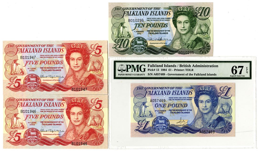 Falkland Islands.É Group of Issued notes, 1984-2011, Includes 1 Pound, 1984, P-13a, blue on brown and yellow underprint, Queen Elizabeth II and right, King penguins and shield at left, seals at right, back show Governor's home and church, PMG graded Superb Gem UNC 67, EPQ; 5 Pounds, 2005, P-17a, red on m/c underprint, King penguins at left, island map at center, Queen Elizabeth II at right center, seals at right, back shows Government House and Christ Church Cathedral in Stanley (2); 10 Pounds, 2011, P-18, green on blue and m/c underprint, Queen Elizabeth II at right, King penguins and shield at left, seals at right, back shows Governor's home and church. All notes are Choice AU-Unc condition. (4). (sold "AS IS", No returns accepted)