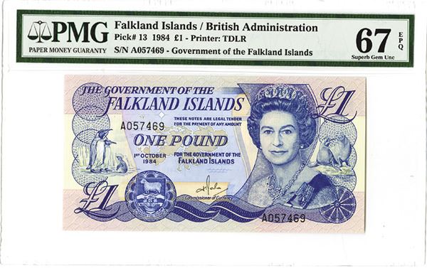Falkland, Islands, £1, P-13, Issued banknote, Blue on m/c, Queen Elizabeth II on right, Superb Gem Uncirculated 67 EPQ.