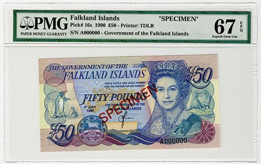 Falkland Islands. Specimen 50 Pounds, 1990, P-16s. PMG graded Superb Gem Unc 67 EPQ (Cert # 5003616-008). TDLR.