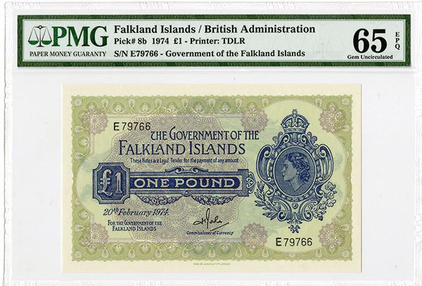 Falkland Islands, issued 1 Pound, P-8b, PMG graded Gem Uncirculated 65 EPQ. TDLR.