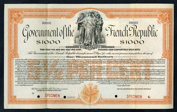 France. $1000 Specimen 5 1/2% Secured Loan Convertible Gold Coupon Bond, Black print on orange border and under tint in horizontal format, Group of allegorical figures standing together at top, Specimen overprints and POC's, Fine-VF condition with toning along upper margins, ABNC.