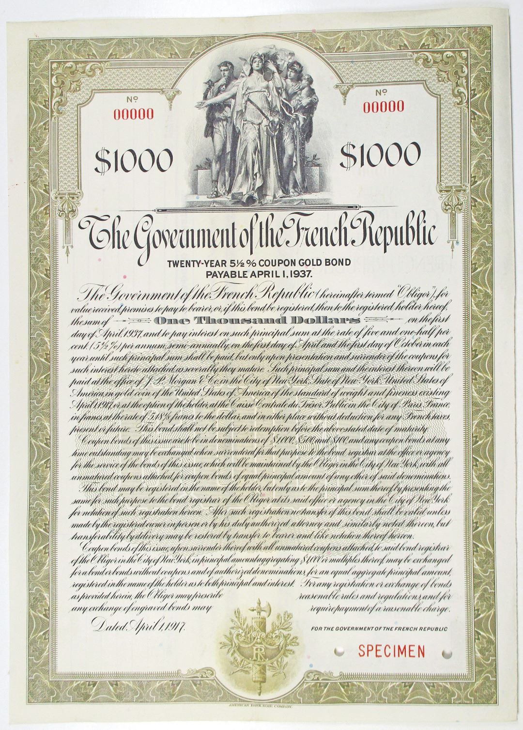 France, 1917. $1000 Specimen 5 1/2% Gold Coupon Bond, Black text with olive border and undertint, Vignette of seated allegorical woman "Justice" holding scales with arms of The United Kingdom of Great Britain and Arms of France flanking her. Facsimile signature of "John Bradbury" as Secretary of the Treasury for Great Britain. Coupons attached. Red specimen overprints, POC's and "00000" serial numbers. XF condition. Extremely rare and attractive bond.