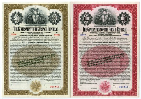 France, 1921. $100 and $500 Lot of 2, 7 1/2% External Gold Loan Sinking Fund Specimen Coupon Bonds, Includes $500, Black print on Brown border and $1000, red border on small sized certificates, Allegorical woman and globe at top, coupons on side, Specimen overprints and POC's, VF-XF condition, ABNC. (2). Sold "AS IS" no returns accepted.