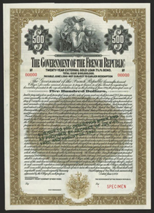 Specimen, $500, 20 Year External Gold Loan 7-1/2% Bond. Brown border. Vignette of allegorical woman with world globe on top and Arms of France on bottom. Overprinted "Subject to 10% Deduction when as Provided by Decrees of July 16, 1935 and August 25, 1937", Coupons attached. Specimen overprints, POC's and "00000" serial numbers. XF condition. Extremely rare and attractive bond.