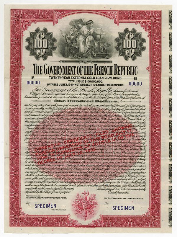 France, $100 Gold Coupon Bond, 7 1/2% Gold Loan Bond, Coupons attached, Black with red border and underprint. Very attractive and rare bond only found in specimen. VF, ABNC.