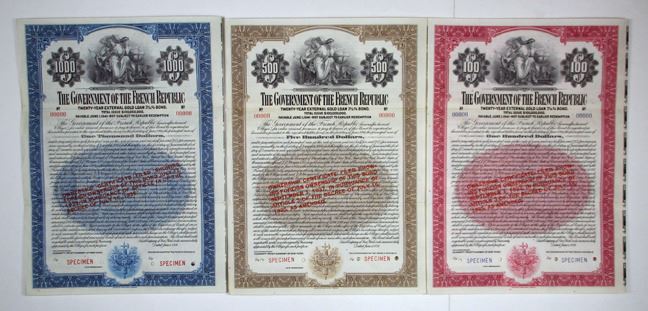France, 1921. $100, $500, & $1000 Trio of Specimen 7 1/2% Coupon Bonds, Black print with Red, Brown, and Blue borders. All have Specimen overprints and POCs. ABNC. (3). Sold "AS IS" no returns accepted.