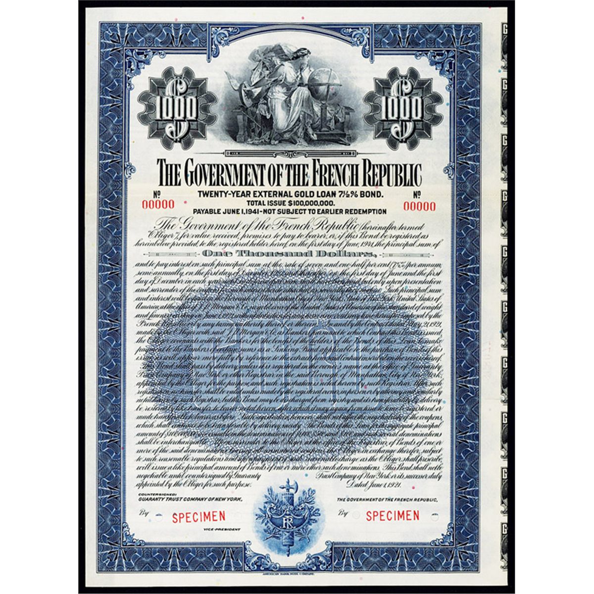 France, 1921, $1000, $1000, 20 Year 5 _% Coupon Gold Bond. Specimen bond, blue border and undertint. Allegorical woman with globe. Red SPECIMEN overprint and POC. Coupons attached. VF Condition. ABNC. Rare bond.