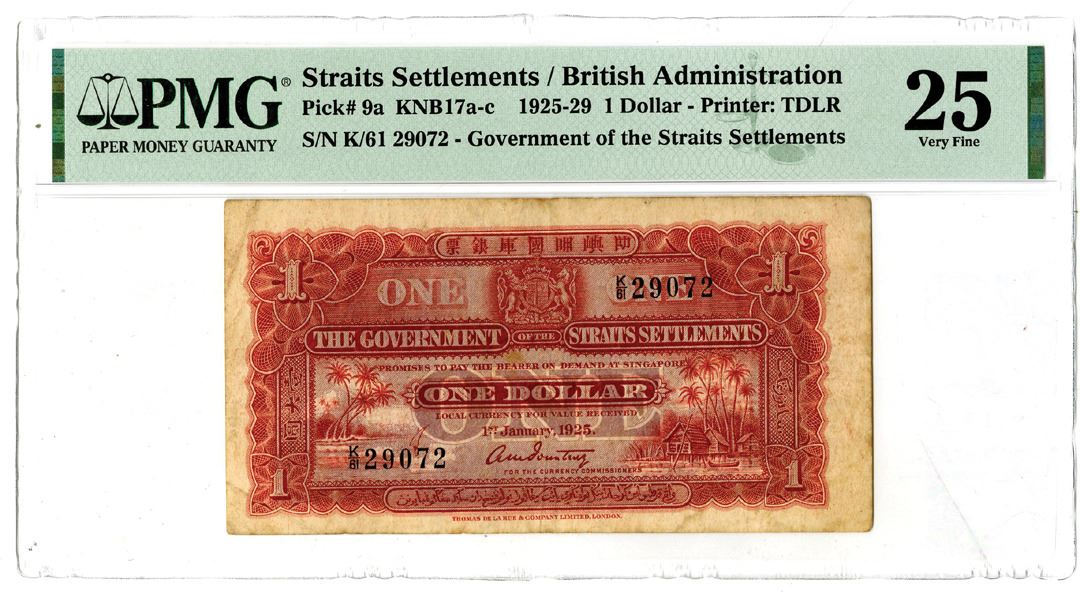 Straits Settlements/British Administration. 1925-29. 1 Dollar, P-9a KNB17a-c, Red on face, S/N K/61 29072, PMG graded Very Fine 25. Printer: TDLR.