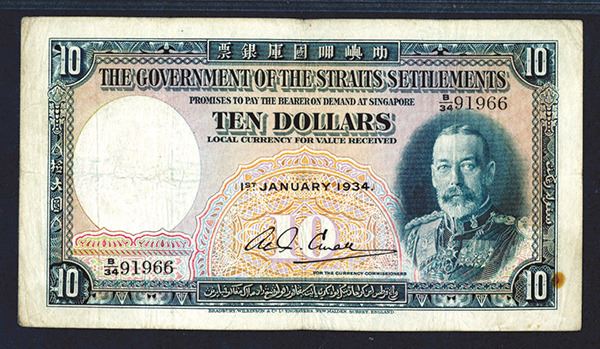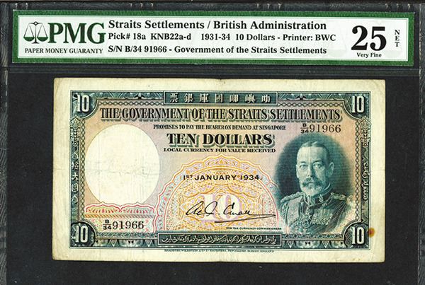 Straits Settlements. 10 Dollars. P-18a. George V at right. BWC. Graded PMG Very Fine 25 NET rust.