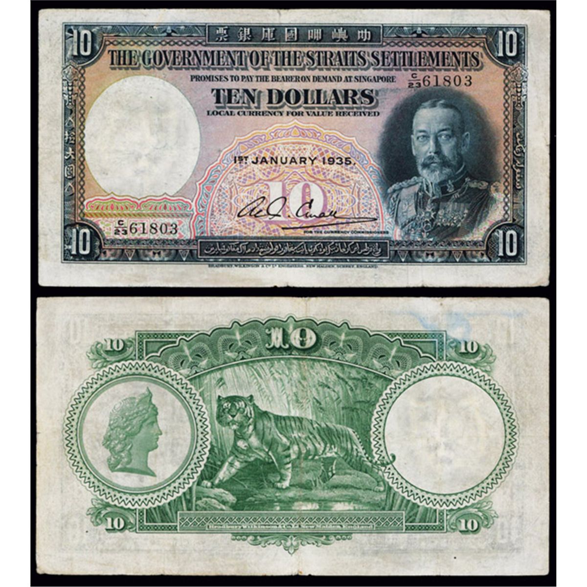 Straits Settlements, 1st January 1935, $10, P-18b Issued banknote, Blue on m/c on face, King George V on right, tiger on back, Payable in Singapore, Fine to Choice Fine Condition with 4+ small pin holes and minute tears on top margin, S/N C/23 61803, BWC.