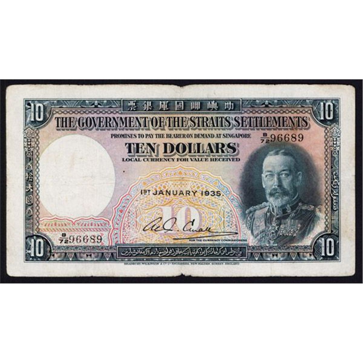 Straits Settlements, 1st January 1935, $10, P-18b Issued banknote, Blue on m/c on face, King George V on right, tiger on back, Payable in Singapore, Choice VG to Fine Condition with 4+ small pin holes , S/NB/72 96689, BWC.