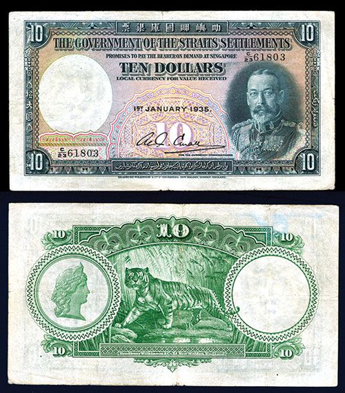 Straits Settlements, 1st January 1935, $10, P-18b Issued banknote, Blue on m/c on face, King George V on right, tiger on back, Payable in Singapore, Fine to Choice Fine Condition with 4+ small pin holes and minute tears on top margin, S/N C/23 61803, BWC.