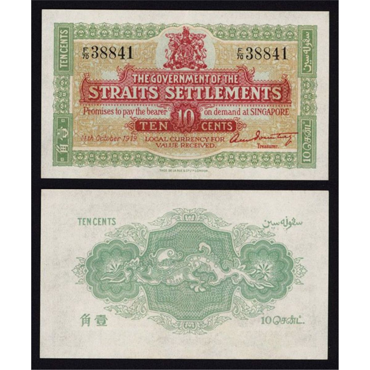 Straits Settlements, 14th October 1919, 10 cents, P-8b Issued banknote, red on green back green, Payable in Singapore, Choice XF-AU, very attractive for issue. TDLR.