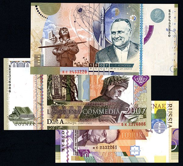 Russia, lot of 3 colorful advertising notes (not legal tender), includes note featuring Boris Jacobi (inventor of electrotyping) and worked at Goznak; note featuring Dante Alighieri for his work La Divina Commedia; and cosmonaut S. P. Korolev. All notes are UNC and unusual.