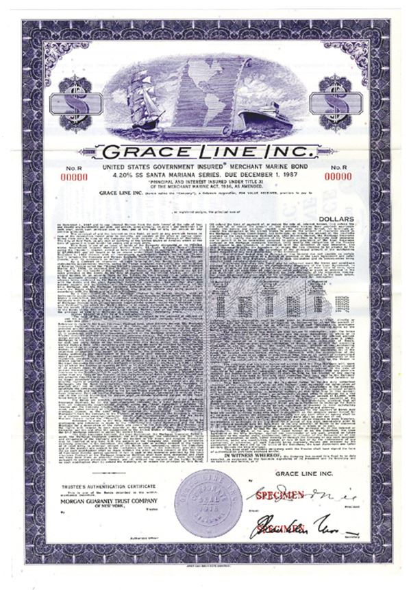 Delaware. $-Odd Specimen 4.20% Insured Merchant Marine SS Santa Mariana Series Bond, Black print on purple border and under tint, Ships out on water at top, Specimen overprints and POC's, VF-XF condition, ABNC.