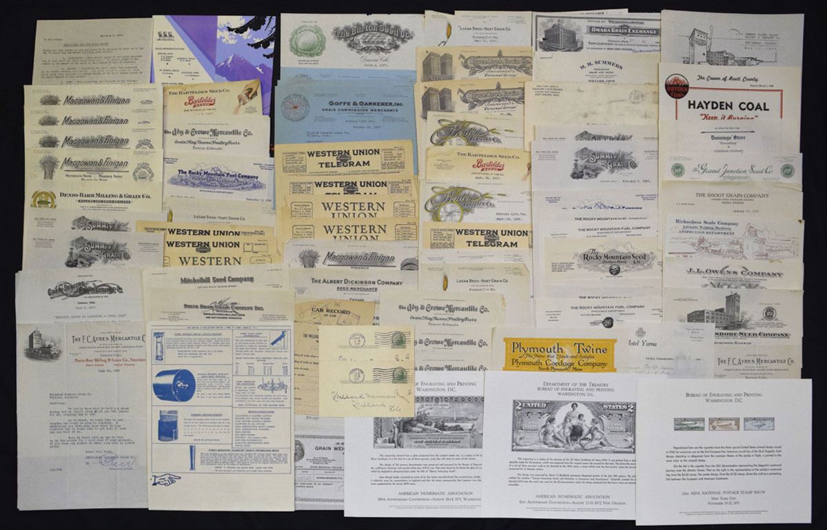 Lot of 70+ illustrated company letterheads and business correspondence from the American agricultural and fuel industries, featuring firms such as Rocky Mountain Fuel Co., Hayden Coal Co., Logan Bros.-Hart Grain Co., Goffe & Carkener Inc., Summit Grain Co., Mitchell Seed Co., F.C. Ayres Mercantile Co., Denio-Haire Milling & Grain Co., and Magowan & Finigan. Includes several Western Union Telegrams, invoices, and promotional material from Plymouth Twine Co. and Bureau of Engraving & Printing souvenir sheets for ANA conventions (1951–1953). Designs showcase grain elevators, industrial plants, wagons, and allegorical vignettes. Conditions range from VF to XF overall, minor folds and handling typical. (70+). Sold ‘AS IS’ no returns accepted.