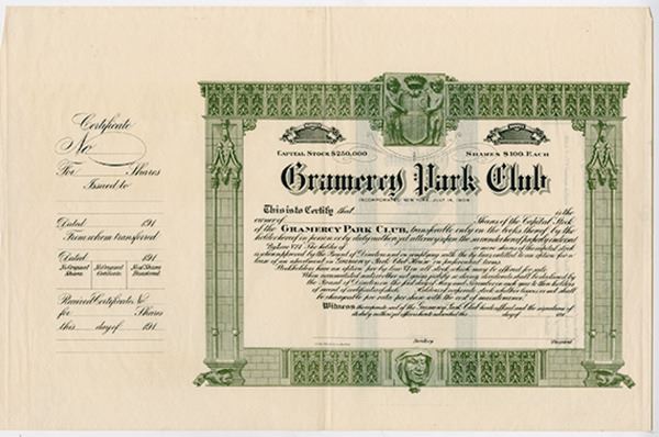 New York, NY... Black on olive, With counterfoil. Large sheet. 1909. Vertical fold. The certificate gives the owner the right to rent an apartment in the Gramercy Park Club House. Rare if not unique. Corlies, Macy & Co.