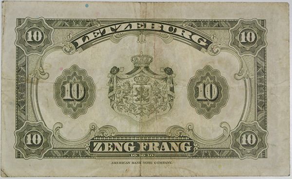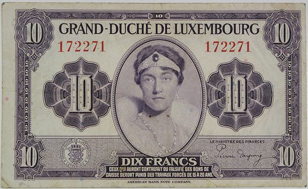 Luxembourg. Issued 10 Francs, 1944, P-44. Radar serial number 172271. VF. ABNC.