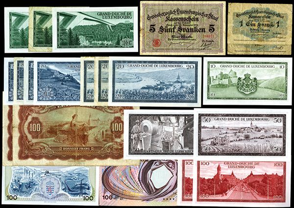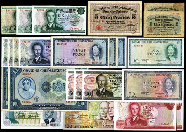 Grand-Duche de Luxembourg, 1914-81, Group of 24 Luxembourg, lot of 24, includes 1 Franc, P-21 and P-27, both Fine; 5 Francs, P-23, VF; 100 Francs, P-47 (2 pcs, both VF); 10 Francs, P-48, UNC; 20 Francs, P-49 (3 pcs, 1 UNC); 50 Francs, P-51, UNC; 100 Francs of the International Bank in Luxembourg, P-14 and P-14A, both UNC; as well as 10-, 20-, 50-, and 100 Francs, P-53 to P-56, mostly UNC.