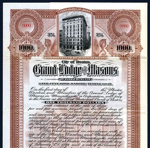 Massachusetts, ND (ca.1900's), $1000, 3% Bond Masonic Temple Loan, Specimen Bond, Building top center, VF-XF condition, ABNC.