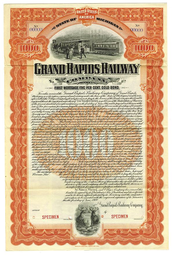 Michigan. $1000 Specimen 5% 1st Mortgage Gold Coupon Bond, Black print on orange border and under tint, Pedestrians crossing in front of electric street cars at top, Specimen overprints and POC's, Fine-VF condition with minor splitting along fold lines condition, ABNC.