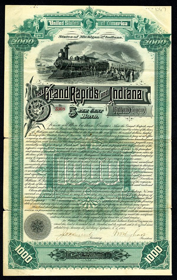 Grand Rapids and Indiana Railroad Co, 1884, Issued Coupon Bond. Michigan and Indiana. $1000, 5% Bond, coupons attached, black on green border and underprint, Locomotive at station R-L, Ornate Homer Lee design, Fine to Fine+ with edge splits at left side horizontal folds, otherwise extremely attractive and scarce bond. HLBNC.