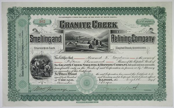 South Dakota, 1900. 15,000 Shares I/U Capital Stock Certificate, Black text with ornate green border and no underprint, At top is a distant scene of a train passing through a refinery. S/N 162, VF condition, Printed by WBN.