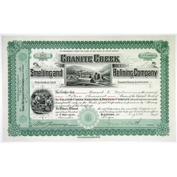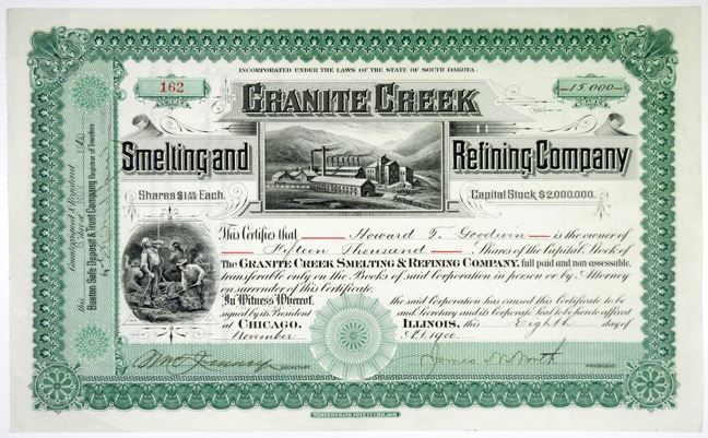 South Dakota, 1900. 15,000 Shares I/U Capital Stock Certificate, Black text with ornate green border and no underprint, At top is a distant scene of a train passing through a refinery. S/N 162, VF condition, Printed by WBN.