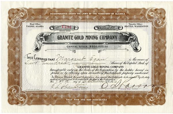 Alaska, 1916. 200 Shares. I/U stock. Brown border. No vignette. XF condition with small separation on lower left fold on bottom margin. N.P.Banknote Co., Tacoma. Incorporated Territory of Alaska. Rare Alaska mining stock.
