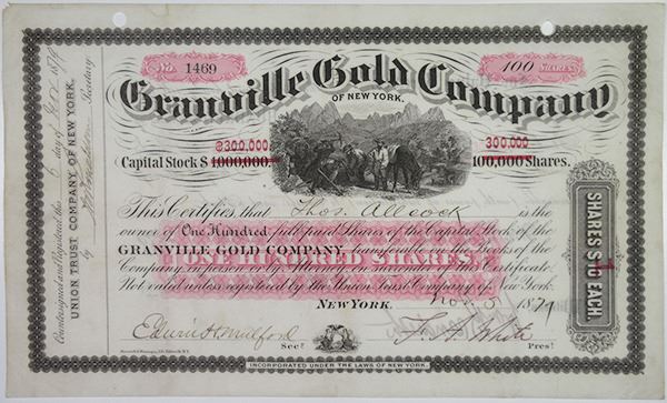 New York. 100 Shares Capital Stock I/U Certificate. Black print on black border with red underprint. Men working mine at center. VF-XF condition with toning around edges. Maverick & Wissinger.
