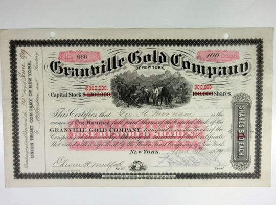 New York, 1879. 100 Shares I/U Capital Stock Certificate, S/N 666, Black text with black border and pink undertint, Men at work mining at top center. VF condition, Maverick & Wissinger.