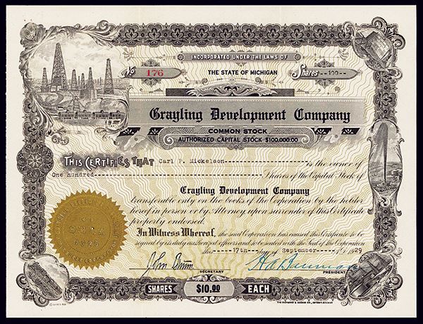 Michigan, 1929, 100 Shs., Oil towers, Gold embossed seal, minor stains on back, otherwise VF+.