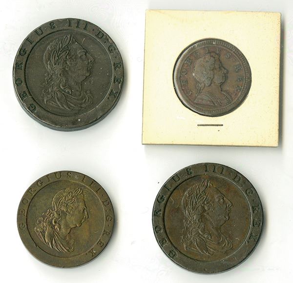 Great Britain, From the George III issues three "Cartwheel" pieces including 1 Penny, 1797, KM# 618, XF, and (2)Two pence, 1797, KM# 619, both VF+ to XF. Also from the George I period 1 Penny, 1723, VF.