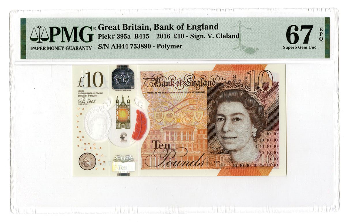 Great Britian, 2016. 10 Pounds, P-395a B415, Issued Banknote, Orange and m/c with portrait of Queen Elizabeth II at right, Back is orange and m/c with Jane Austen at center, Polymer printed note with multiple security features, S/N AH44 753890, PMG graded Superb Gem Unc 67 EPQ.