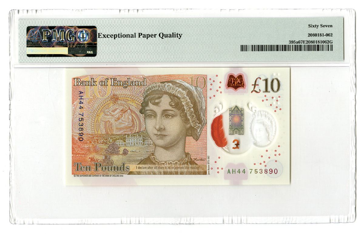 Great Britian, 2016. 10 Pounds, P-395a B415, Issued Banknote, Orange and m/c with portrait of Queen Elizabeth II at right, Back is orange and m/c with Jane Austen at center, Polymer printed note with multiple security features, S/N AH44 753890, PMG graded Superb Gem Unc 67 EPQ.