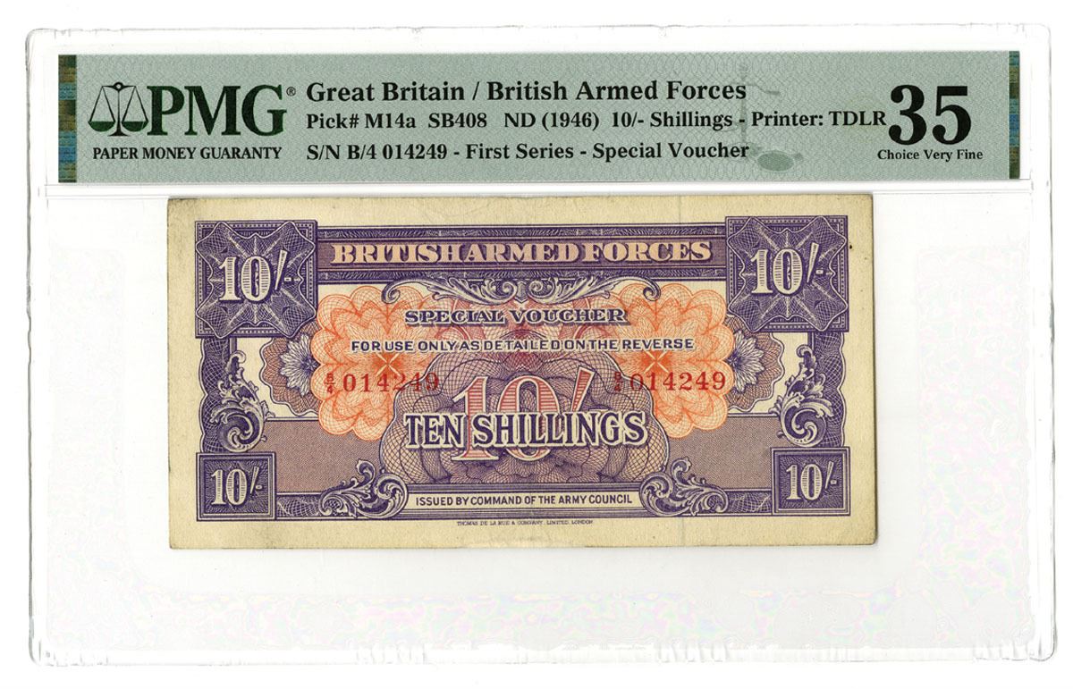 Great Britain, ND (1946). 10/- Shillings, P-M14a SB408, First Series Issued Banknote, Purple on orange and red-brown underprint, Back is purple with orange and red, S/N B/4 014249, PMG graded Choice Very Fine 35, TDLR.