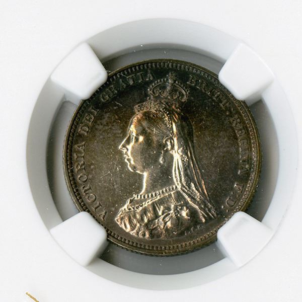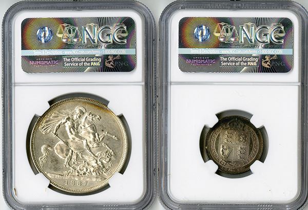 1 Crown, 1887, KM# 765, NGC graded UNC Details w/ comment "Surface Hairlines" (2711811-016); and 1 Shilling, 1887, KM# 761, NGC graded UNC Details w/ comment "Surface Hairlines" (2711811-009).