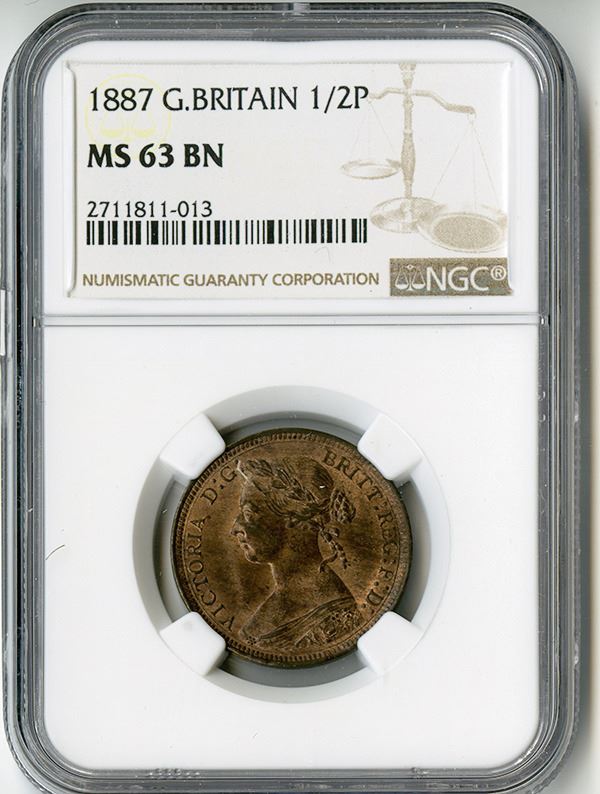 Great Britain, 1/2 Penny, 1887, KM# 754, NGC graded MS 63 BN (2711811-013) though it deserves an RB designation in our opinion as it has much red.