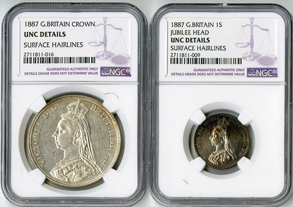 Great Britain, 1 Crown, 1887, KM# 765, NGC graded UNC Details w/ comment "Surface Hairlines" (2711811-016); and 1 Shilling, 1887, KM# 761, NGC graded UNC Details w/ comment "Surface Hairlines" (2711811-009).