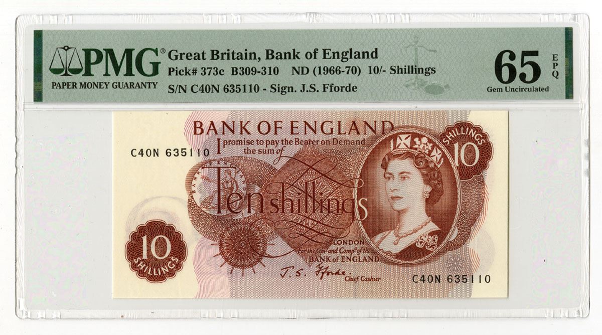 Great Britian, ND (1966-70). 10/- Shillings, P-373c B309-310, Issued Banknote, Brown on m/c underprint with portrait of Queen Elizabeth II at right, Back has Britannia seated with shield in circle at center, S/N C40N 635110, PMG graded Gem Uncirculated 65 EPQ.