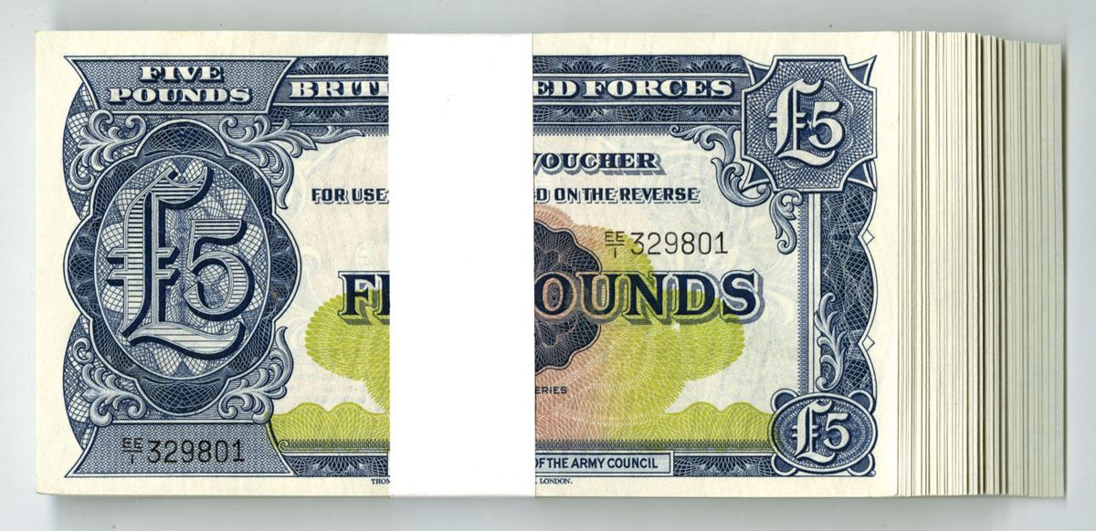 Great Britian, ND (1958). 5 Pounds, P-M23 (100), Second Series Sequential Issued Armed Forces Special Vouchers, Dark blue with olive and brown underprint, Back is blue and m/c with denomination at center, S/Ns EE/1 329801 to EE/1 329900, Notes are wrapped in original packaging, UNC to Gem UNC condition. TDLR. (50). Sold "AS IS" no returns accepted.