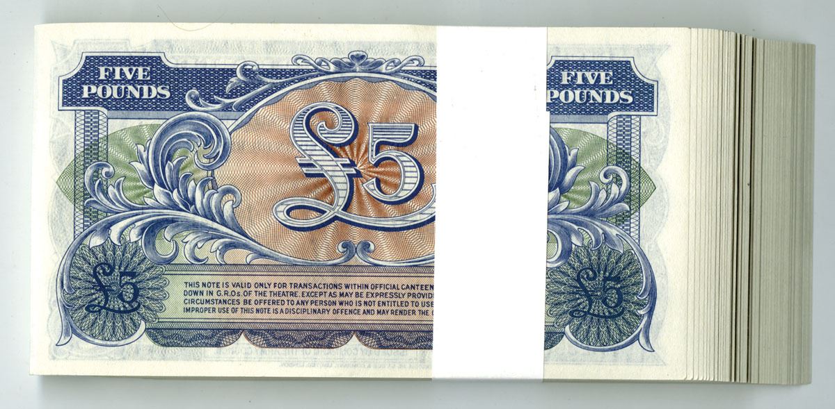 Great Britian, ND (1958). 5 Pounds, P-M23 (100), Second Series Sequential Issued Armed Forces Special Vouchers, Dark blue with olive and brown underprint, Back is blue and m/c with denomination at center, S/Ns EE/1 329801 to EE/1 329900, Notes are wrapped in original packaging, UNC to Gem UNC condition. TDLR. (50). Sold "AS IS" no returns accepted.