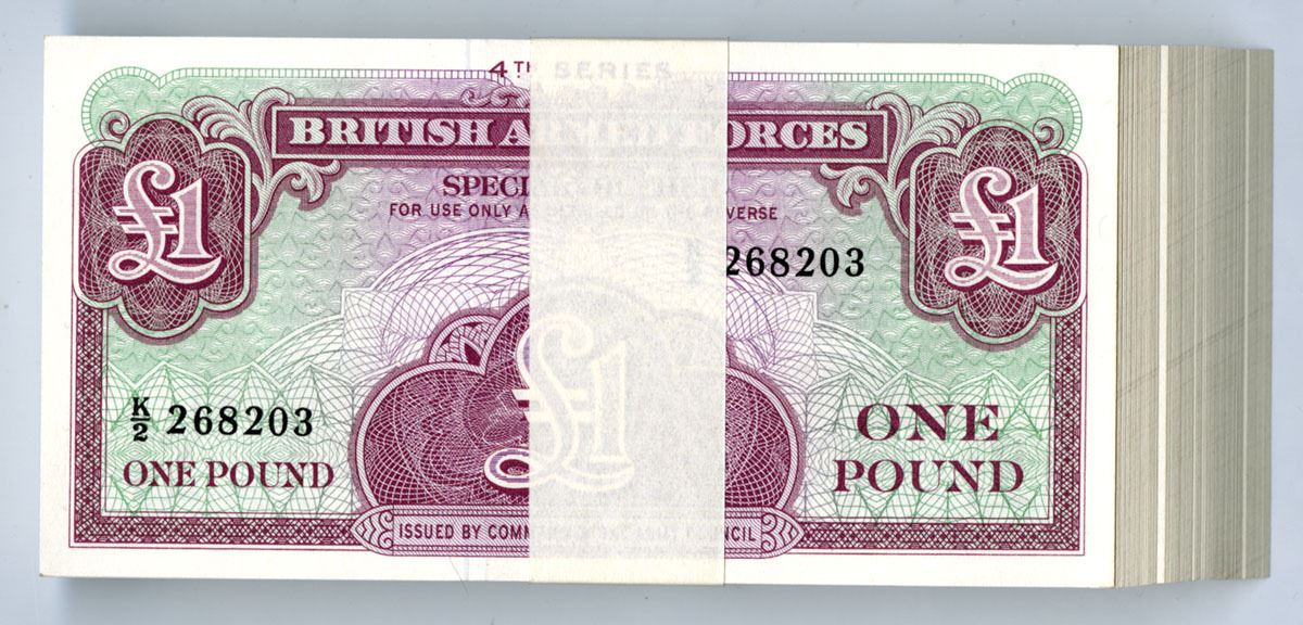 Great Britian, ND (1962). 1 Pound, P-M36a (96), Fourth Series Issued Banknote Assortment, Violet on pale green and lilac underprint, Back is lilac and m/c with denomination at center, S/Ns K/2 268203 to K/2 268298, Banknotes range from UNC to Gem UNC condition. TDLR. (96). Sold "AS IS" no returns accepted.