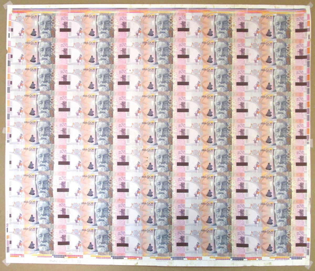 United Kingdom, 2005. Uncut Sheet of 45 Specimen Banknotes, M/C printing with Man and Pegasus at right, Extended margins all around with color blocking, VF-XF condition with stains at bottom left corner.