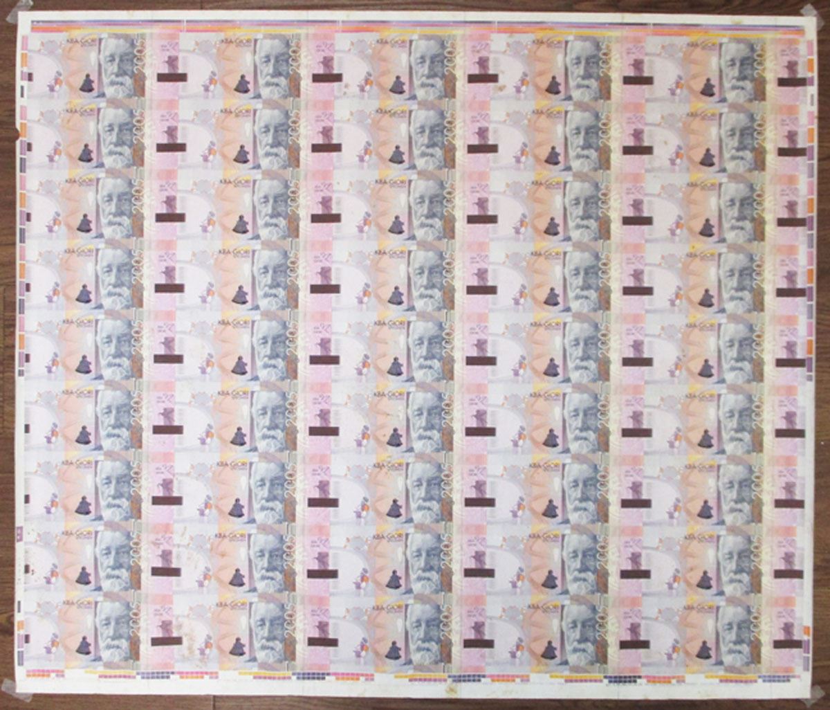 United Kingdom, 2005. Uncut Sheet of 45 Specimen Notes, M/c printing with Man and Pegasus at right, Extended margins all around with color blocking, VF-XF condition with stains at bottom left corner.