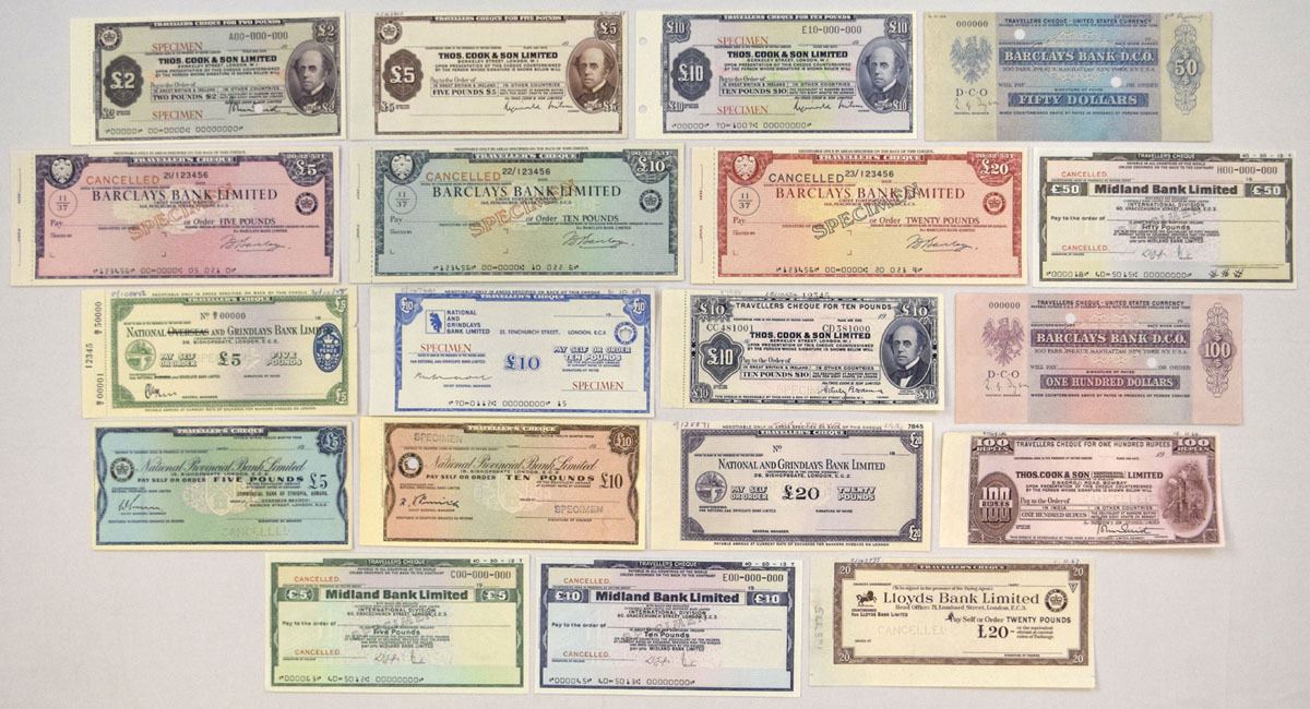 Great Britian, ca.1950-90s. Lot of 19 Specimen Traveler's Checks from National Provincial Bank Ltd., National Overseas and Grindlay's Bank Ltd., Barclays Bank Ltd., Thos. Cook and Son Ltd., and others. Checks are for Pounds and other world currencies, are marked Specimen with overprints and pin punches, and range from UNC to Gem UNC condition. (19). Sold "AS IS" no returns accepted.