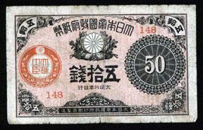 Lot of 3 notes. ND (1931). 10 Sen, P-46, Fine to Fine+; 20 Sen, P-47, VG+ to Fine; 50 Yen. P-48, VG to VG+ condition. All are black on different color under prints with red seals on left. Issued banknotes.