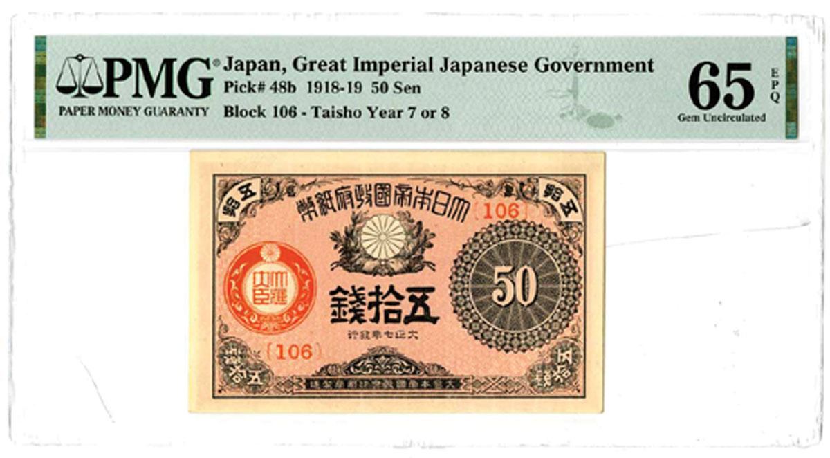 Japan, 1918-19. 50 Sen, P-48b, Issued Banknote. Black on pink underprint with red seal at left and denomination numeral at right. Block 106. PMG graded Gem Uncirculated 65 EPQ. Only 3 examples graded in the PMG census and this is the only uncirculated graded example. The second example in the PMG census only grades VF. This will be impossible to improve upon. (From the Allen Berk Collection)