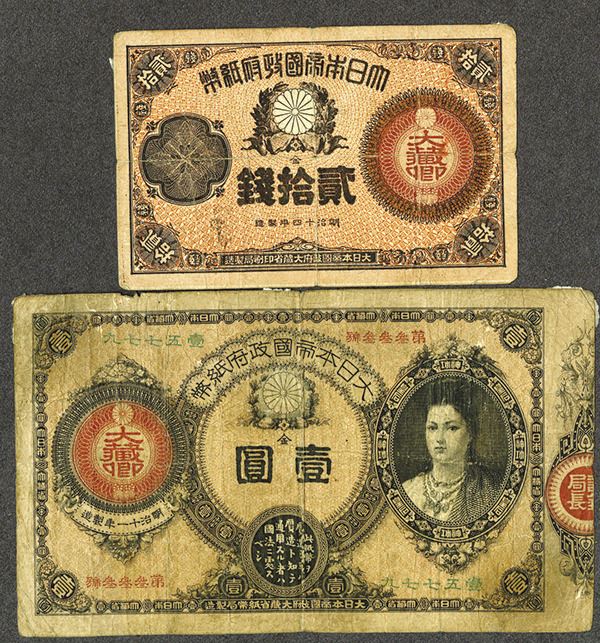Japan, Lot of 2 notes, Includes 1881 (1882) 20 Sen, P-15, Brown underprint, brown seal at right, Choice Fine to VF; and 1878 (1881), 1 Yen, P-17, Issued banknote, Portrait of Empress Kingu at right, black on brown underprint, back with red seal, Choice Fine to VF with 3 small areas of mounting remnants on the top back margin that can probably be removed. Scarce notes in any condition and these are very nice for the grade.
